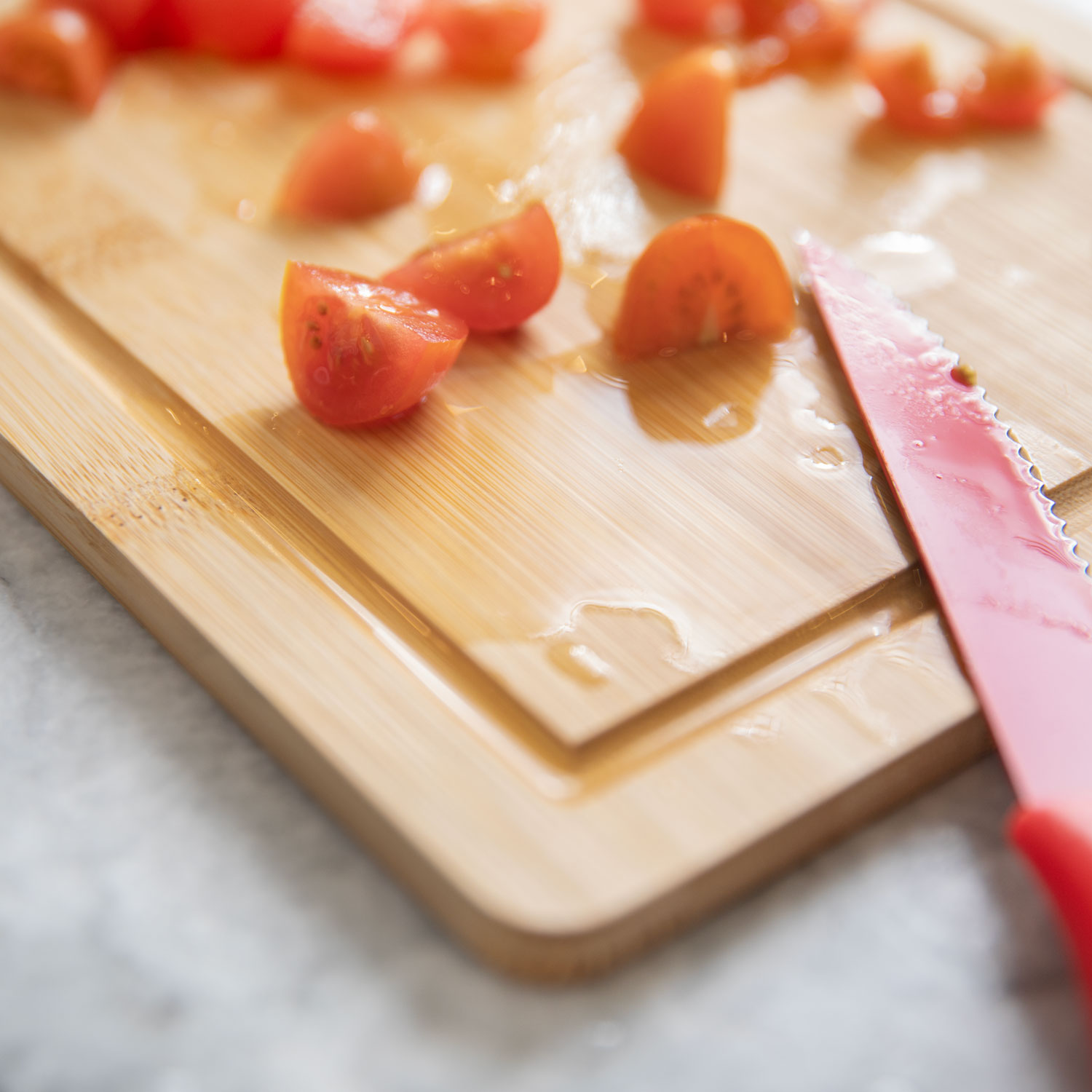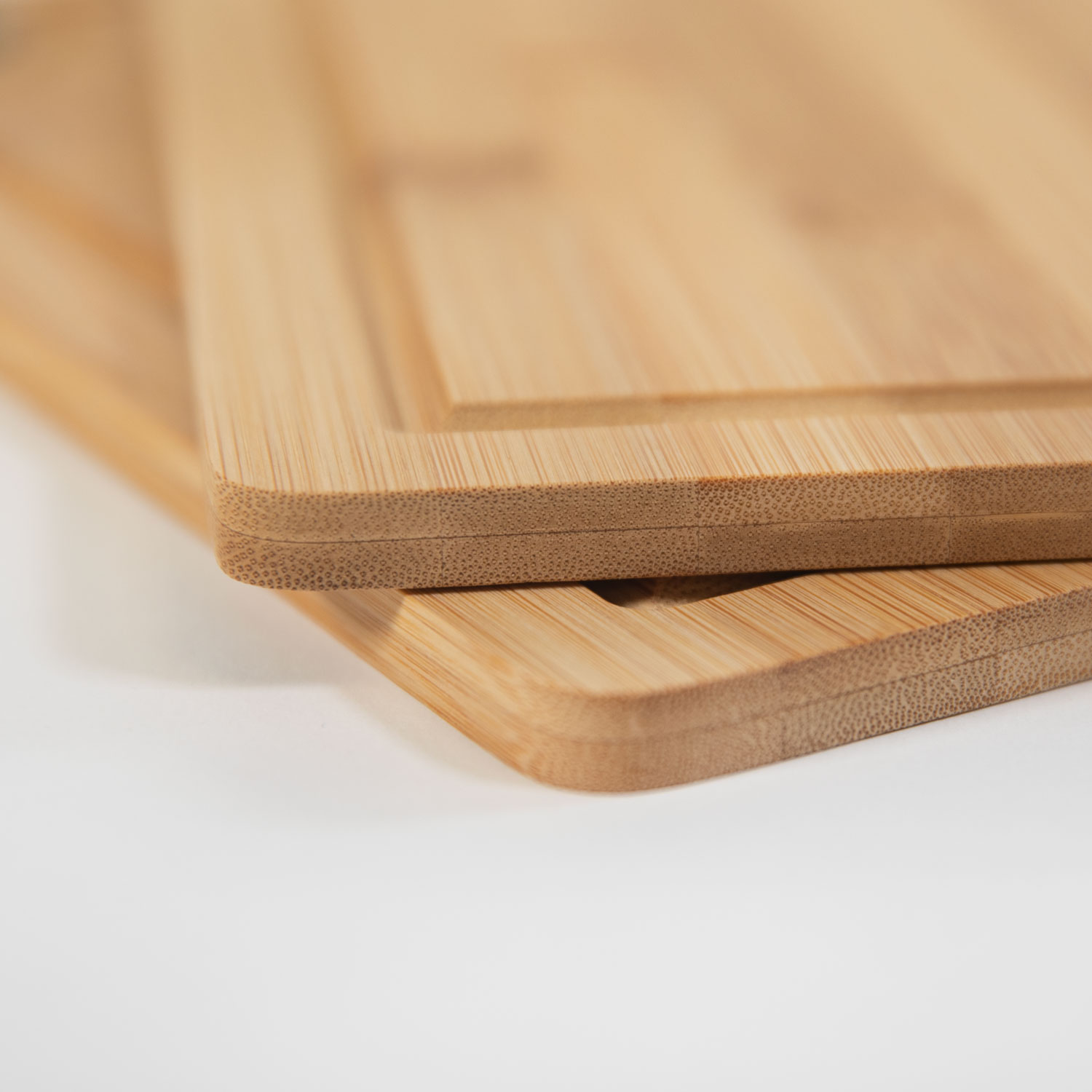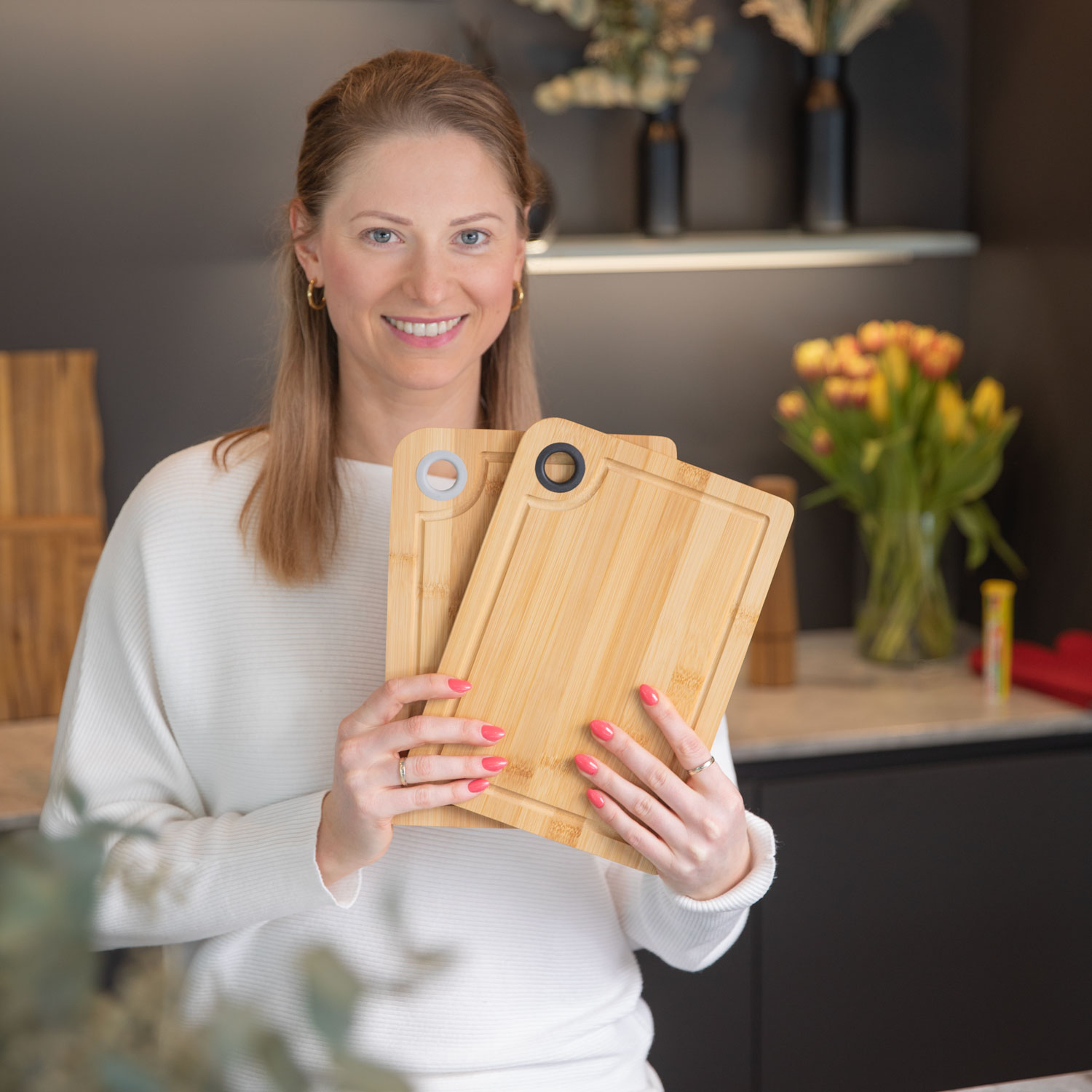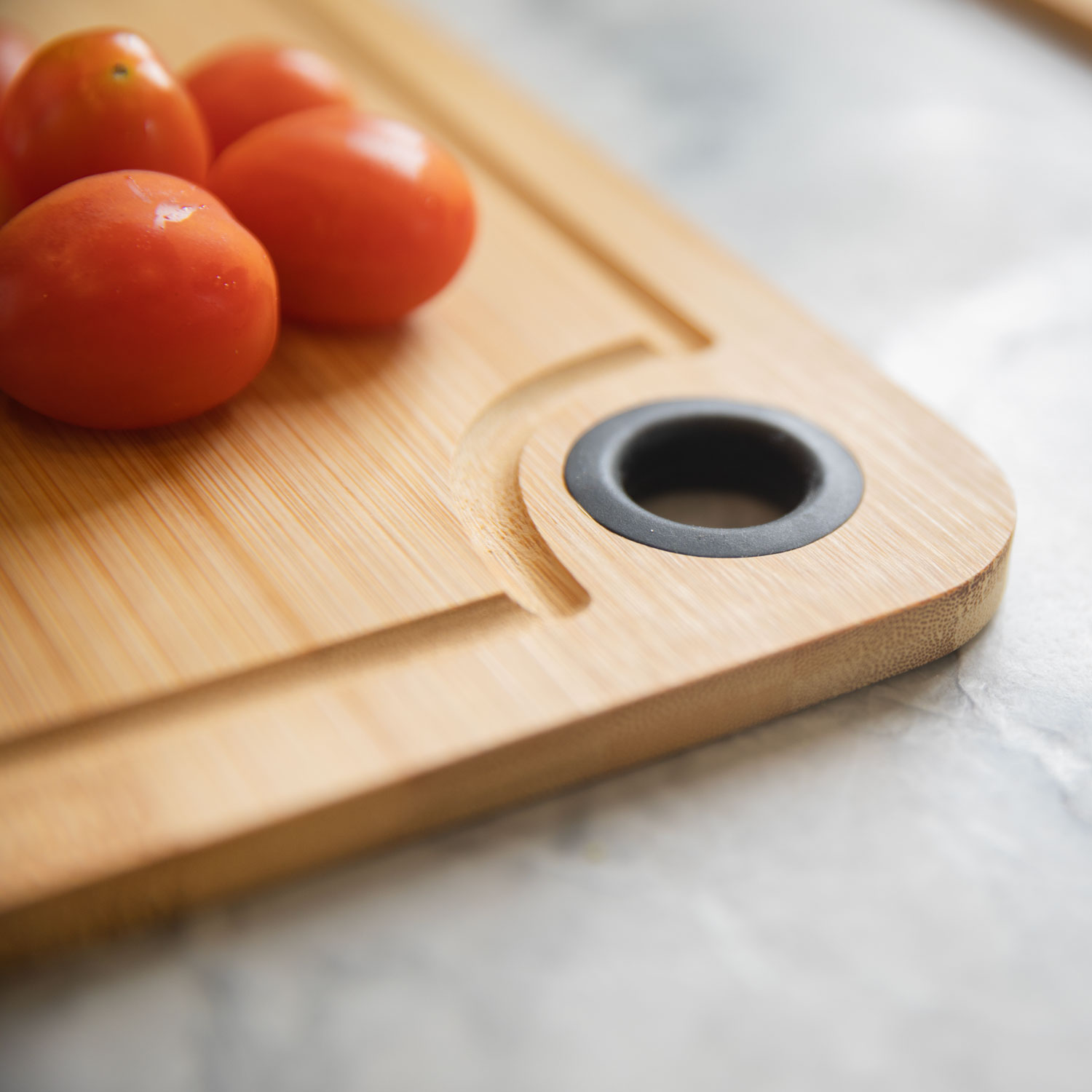 Das Schneidebrett mit umlaufender Saftrille besteht aus dem Naturstoff Bambus und hat einen Silikonring für das praktische Aufhängen. Das Schneidebrett hat eine Größe von ca. 28 x 20 x 1 cm und kann sowohl in der Küche, als auch zum Servieren oder sogar als Tellerersatz beim Frühstücken eingesetzt werden.
