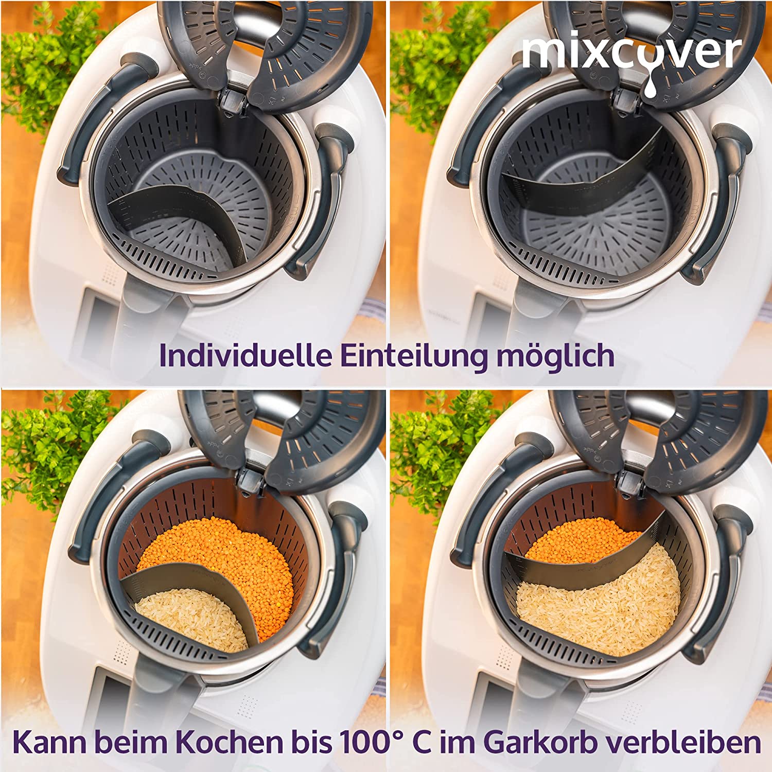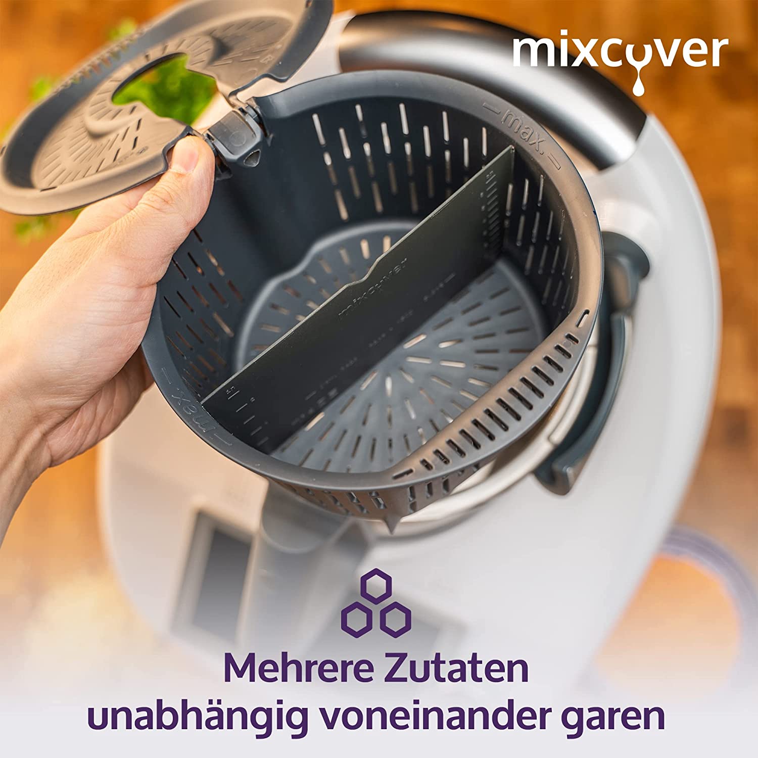 - Trennt den Garkorb in zwei Bereiche, sodass z.B. Reis und Gemüse unabhängig voneinander gegart werden können