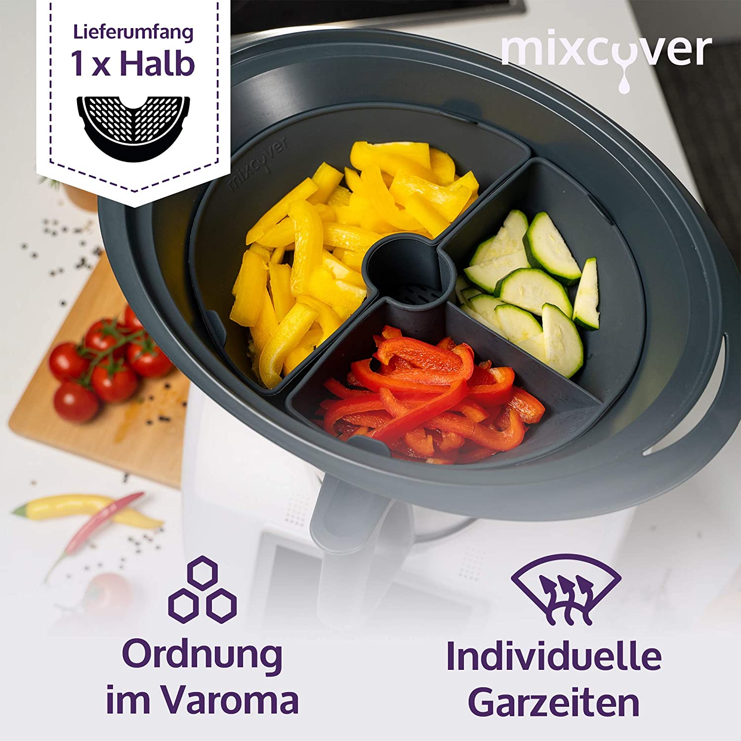 Schneller, sauberer, einfacher und ökologischer: mit der Silikonform für den Thermomix® Varoma.Die beliebte Varoma-Silikonform ist ideal für TM31/TM5/TM6/TM-Friend Fans, die gerne sauber und gleichzeitig umweltbewusst kochen und backen möchten. Sie ist wiederverwendbar und umkompliziert in der Anwendung. Die Arbeit wird erleichtert und Kochen macht gleich noch mehr Spaß!Spezifikationen:Von Flüssigkeit in den Mixtopf bzw. in den Varoma-Behälter. So behält jedes Gericht, was Sie zubereiten, seine Optik und seinen Geschmack.Auch bei hohen Temperaturen im Backofen oder im Varoma kann diese lebensmittelechte und zertifizierte Silikonform eingesetzt werden.Die Oberfläche verhindert jegliches Anbrennen oder Ankleben der Speisen auf der Folie - so können Kuchen, Fisch oder Omeletts mühelos zubereitet werden.Extra breite Dampfdurchlässen garantieren perfekte gegarte Speisen – im Ofen können diese nun unmittelbar ohne umfüllen verfeinert werden.Kein mühevolles Reinigen der Varoma-Bedampfungsschlitze mehr.