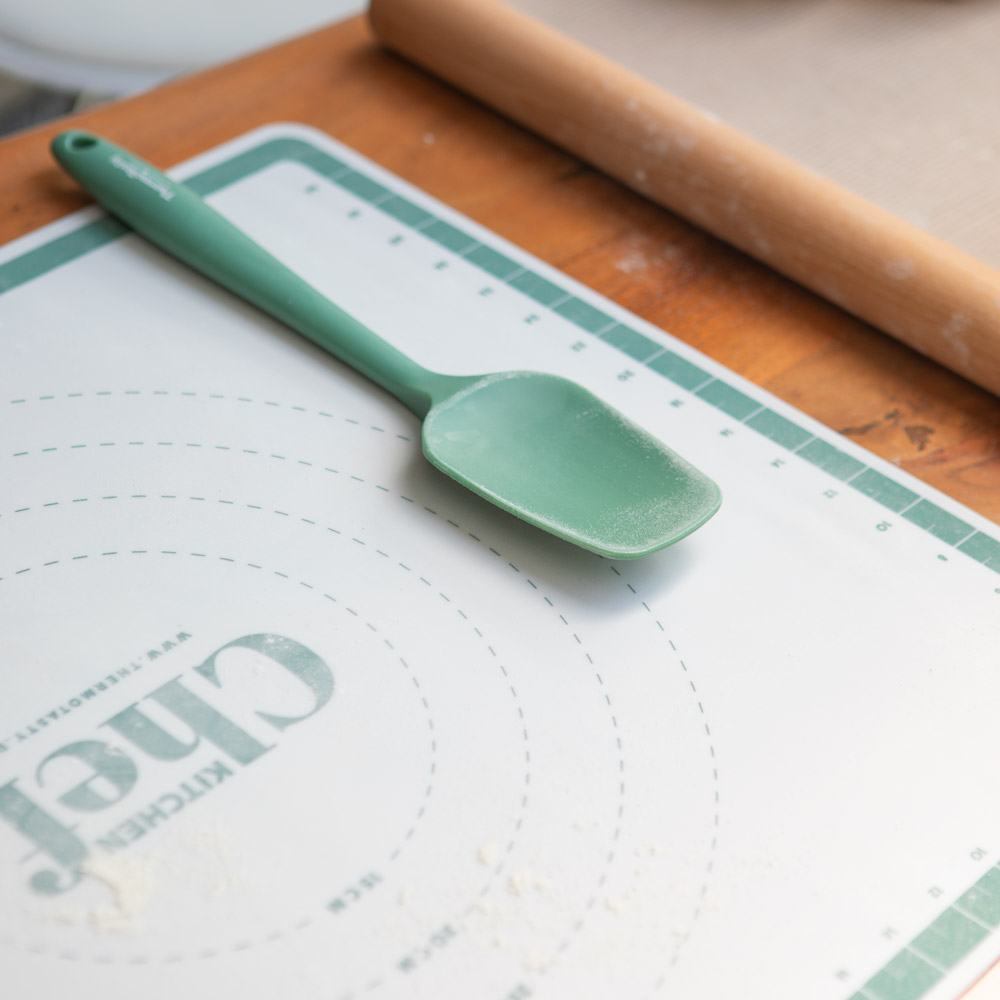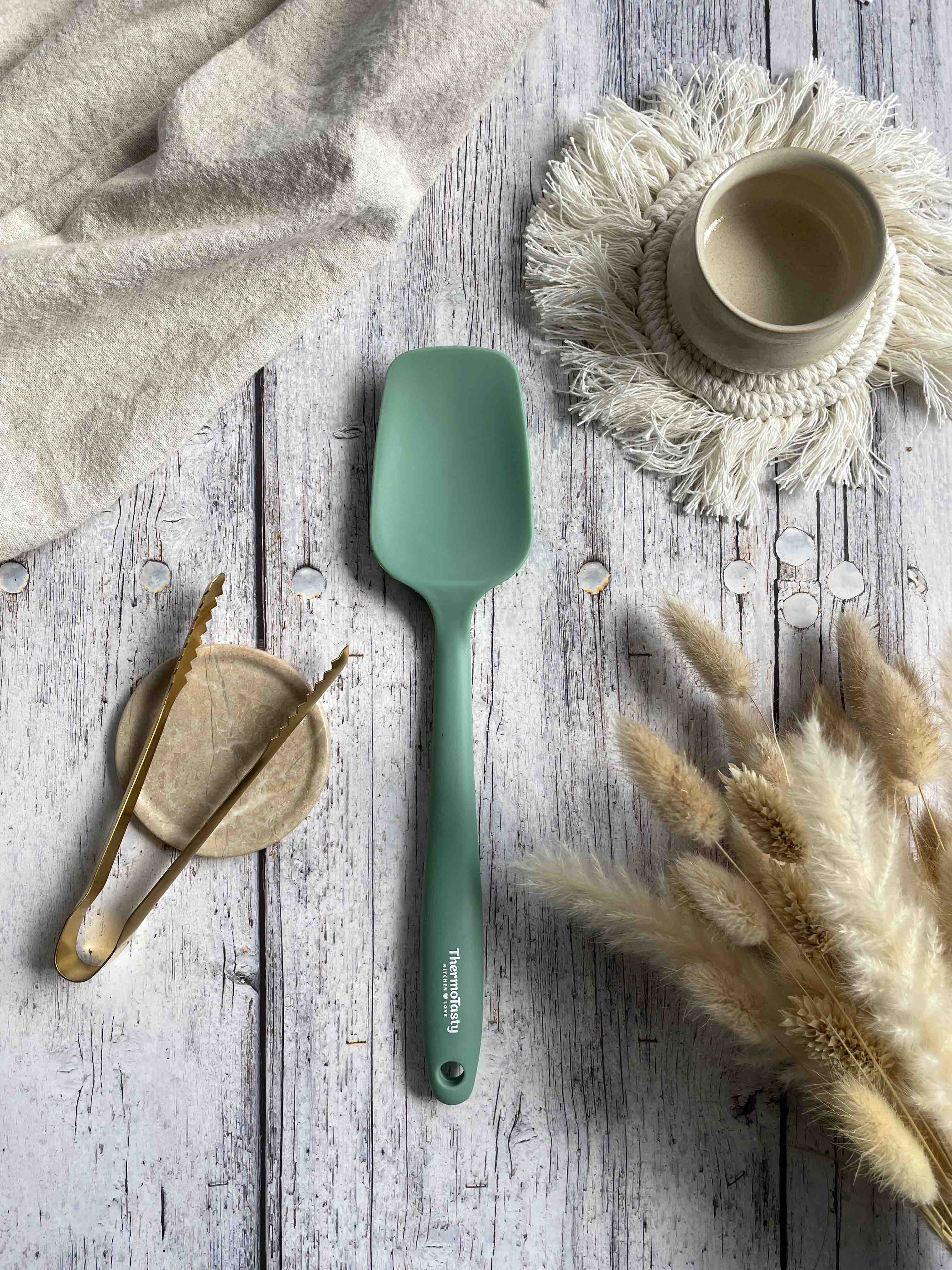 Viele Dinge erleichtern oft das Leben. Warum nicht auch etwas Praktisches für die Küche? Auch für die Küche ist es wichtig, die richtigen und vor allem die praktischen Küchenhelfer daheim zu haben. Schon das ein oder andere Gerät kann viel Zeit und Nerven in der Küche ersparen.Der Spatel eignet sich zum Streichen, Umrühren, Unterheben, Schneiden, Schaben, Auskerben, Füllen, Wenden etc. Der praktische Küchenhelfer besteht aus Silikon und schützen damit die geliebten Edelstahl-Kochtöpfe /-Schüsseln und antihaftbeschichteten Pfannen. Dieser Spatel erweitert durch seine trendige Farbe deine ThermoTasty-Kollektion und ist aber nur eine begrenzte Zeit erhältlich.Spezifikation:Küchenspatel aus SilikonZum Umrühren, Streichen und DekorierenIdeale Verwendung bei antihaftbeschichteten Töpfen und PfannenFür den Thermomix® geeignetGröße: Spatel 27,5 x 5,4cm, 75g