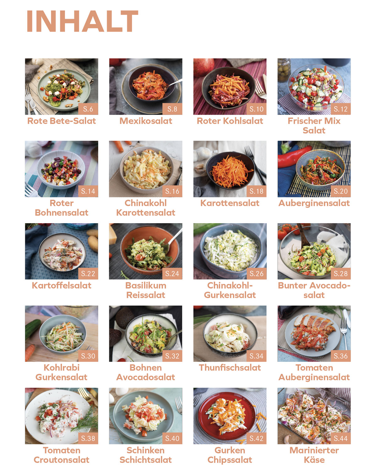 In diesem Rezeptheft findest du 20 bunt gemischte Salatkreationen, die du schnell und einfach anrichten kannst. Du benötigst nicht viel Vorbereitungszeit und zauberst im Handumdrehen eine vitamin- und mineralstoffreiche Mahlzeit für dich und deine Familie. Das Heft enthält sowohl Salate, die ausschließlich aus Gemüse bestehen, als auch sättigende Salate mit Kohlenhydratquellen wie Reis oder Kartoffeln.