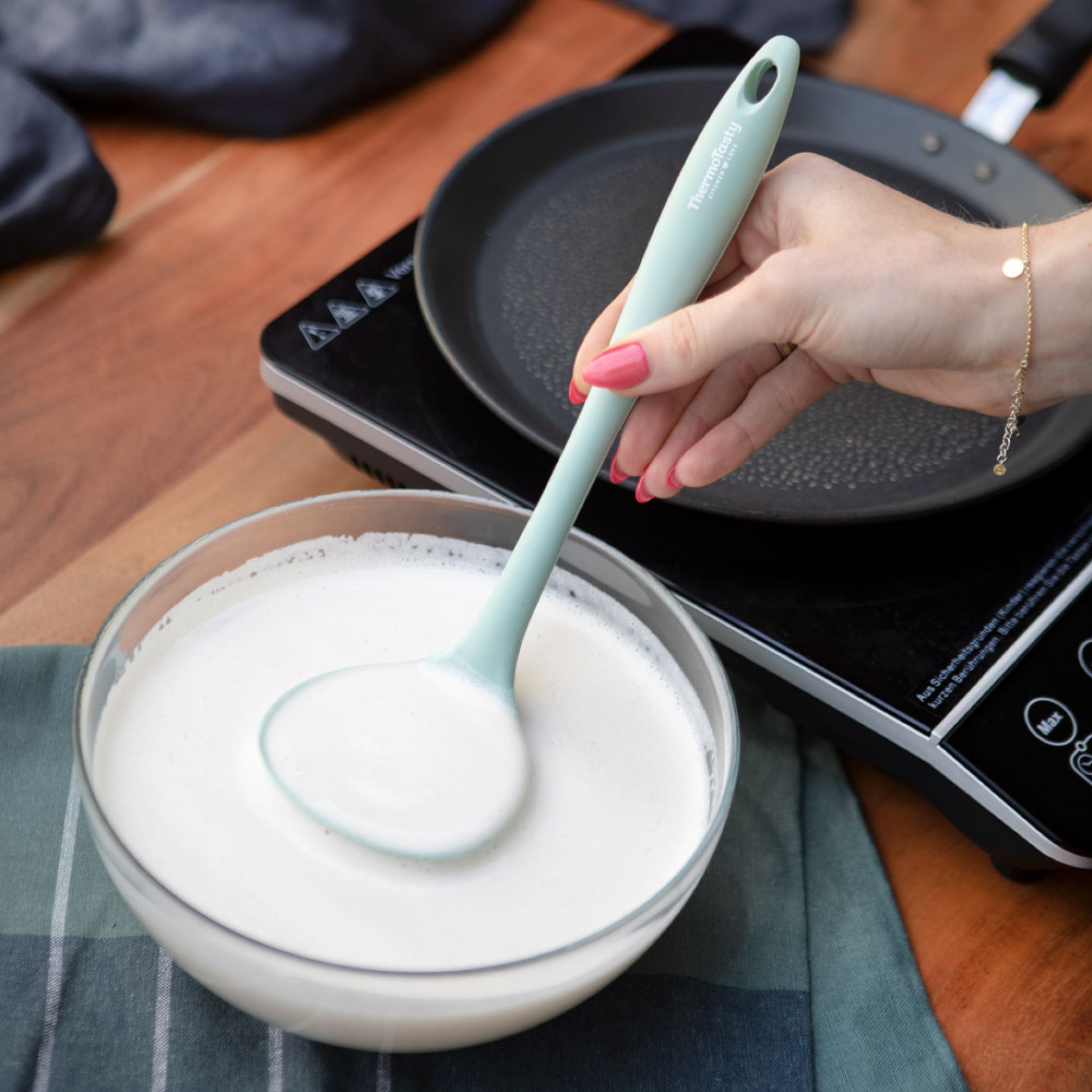 Viele Dinge erleichtern oft das Leben. Warum nicht auch etwas Praktisches für die Küche? Auch für die Küche ist es wichtig, die richtigen und vor allem die praktischen Küchenhelfer daheim zu haben. Schon das ein oder andere Gerät kann viel Zeit und Nerven in der Küche ersparen.Dieses trendfarbige Pinsel-, Löffel- und Spatelset von ThermoTasty erleichtert das Kochen und Backen in vielerlei Hinsicht. Das Set ist aus Silikon hergestellt und daher besonders flexibel. Das Set kann zum Umrühren, Bestreichen, Unterheben, Schneiden, Schaben, Füllen, Wenden etc. verwendet werden. Die praktischen Küchenhelfer bestehen aus Silikon und schützen damit die geliebten Edelstahl-Kochtöpfe /-Schüsseln und antihaftbeschichteten Pfannen und Backformen. Im Inneren befindet sich ein Nylonkern, der für mehr Widerstand, Stabilität und Langlebigkeit sorgt. Die ergonomischen Griffe sind wohlgeformt und bieten sicheren und festen Halt. Am Griffende ist ein Loch integriert, sodass das Set aufgehängt und platzsparend aufbewahrt werden kann. Beide Küchenhelfer sind hitzebeständig bis 230° Grad und leicht in der Reinigung (spülmaschinentauglich). Dieses Set ist frei von bedenklichen Weichmachern – geprüft gem. den geltenden Vorschriften im Lebensmittel- und Futtermittelgesetzbuch (LFGB).Tipp: Dieses Küchenhelferset ist bestens für den Thermomix® geeignet. Die Breite ist so konzipiert, dass der Pinsel bzw. der Löffel zwischen Messerklinge und Mixtopfrand verwendet werden kann, um so das zubereitete Essen aus dem Thermomix® bestens zu entnehmen. Das Ausleeren des Mixtopfes von Soßen oder Smoothies ist damit sehr simple.Diese praktischen Küchenhelfer unterstützen jeden Hobby- als auch Chefkoch.Spezifikationen:All-in-One Kochutensilien aus SilikonZum Umrühren, Mixen, Schneiden, Bestreichen und DekorierenIdeale Verwendung bei antihaftbeschichteten Töpfen und PfannenFür den Thermomix® geeignetGröße: Spatel 21,5 x 4,2 x 1,1cm, 42g / Löffel 20,5 x 4,5 x 1cm, 48g / Pinsel 20,5 x 3,5 x 1cm, 45g