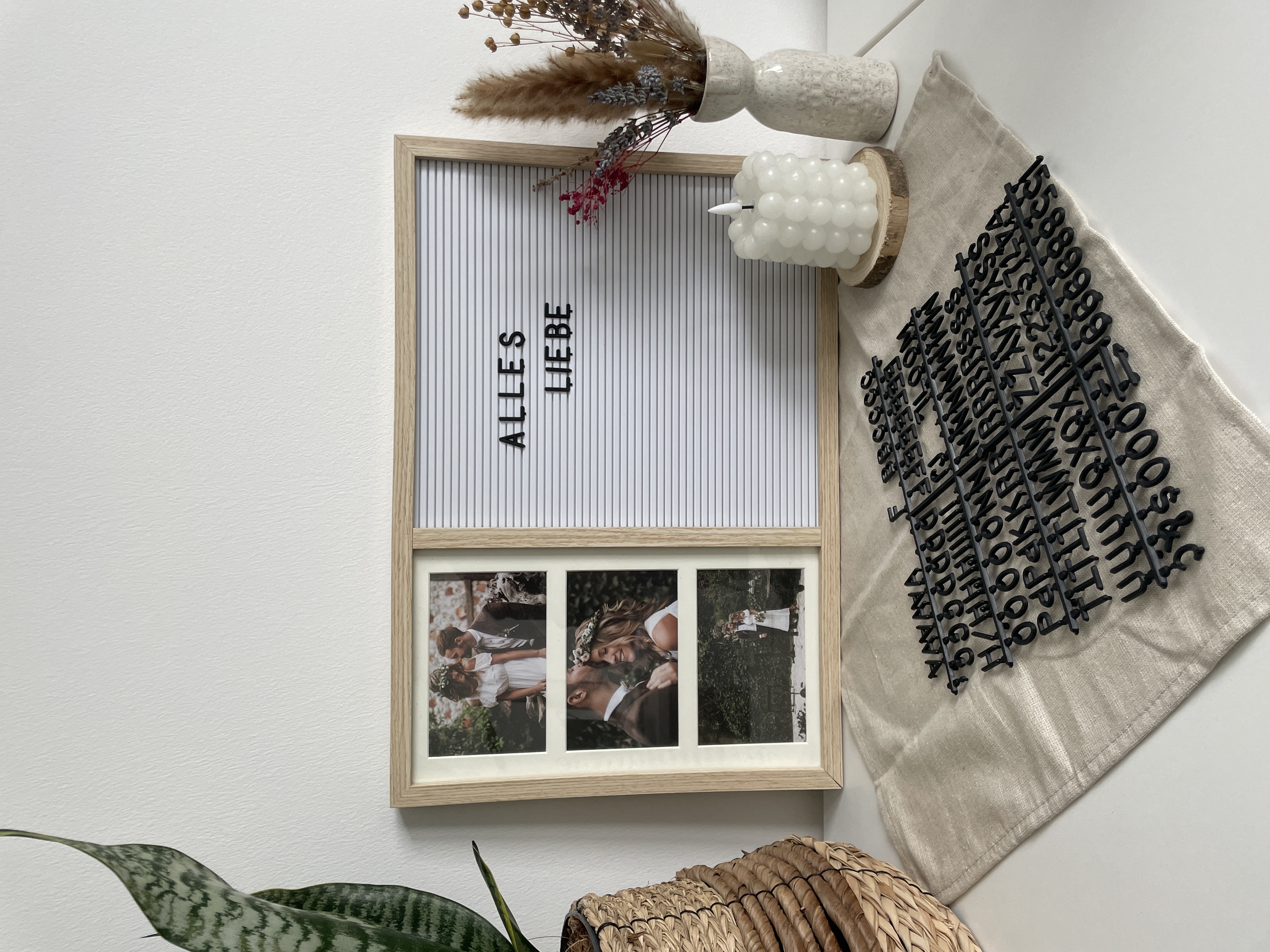 Der kreative Bilderrahmen mit integrierter Notiztafel ist die ideale Lösung, um deine Lieblingsfotos zu präsentieren und gleichzeitig wichtige Notizen, Erinnerungen und Botschaften im Blick zu behalten. Dieses vielseitige Produkt vereint Stil und Funktionalität und ist eine großartige Ergänzung für dein Zuhause, dein Büro oder jeden anderen Ort, an dem du deine Erinnerungen festhalten möchtest.Spezifikationen:Bilderrahmen mit bis zu 3 Fotos (10 x 15 cm)Individuell gestaltbare NotiztafelRahmengröße: 35 x 50 x 2 cmInkl. 145x Buchstaben und ZahlenIdeales Geschenk: Geburtstag, Geburt, Einweihungsfeier, Hochzeit, Jubiläum