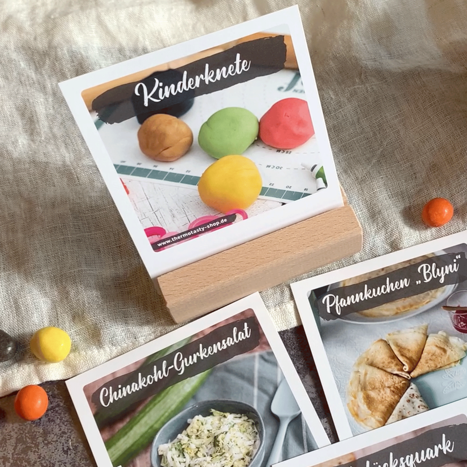Praktische Rezeptkarten zum Aufstellen in der Küche. In diesem Set befinden sich einige Lieblingsrezepte, u. a. das Rezept für Pfannkuchen, Gemüsepaste, Kinderknete. Auf den Vorderseiten findest du jeweils einen Serviervorschlag und auf der Rückseite befindet sich die vollständige Schritt-für-Schritt-Anleitung. Der dazu gelieferte Holzaufsteller hat eine schräge Kerbe, sodass die Rezeptkarten in einem schönen Blickwinkel aufgestellt werden können. Spezifikationen:10x Rezeptkarten im Polaroid-FormatInkl. passendem Holzständer Vorderseite: Serviervorschlag, Rückseite: Rezeptanleitung Größe Rezeptkarten ca. 12 x 10 cmGröße Holzaufsteller ca. 10 x 4 x 2,7 cm