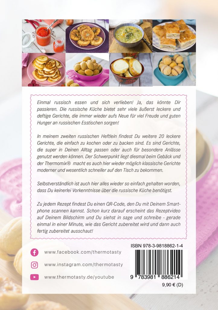 In meinem zweiten russischen Heftlein findest Du weitere 20 leckere Gerichte, die einfach zu kochen oder zu backen sind. Es sind Gerichte, die super in Deinen Alltag passen oder auch für besondere Anlässe genutzt werden können. Der Schwerpunkt liegt diesmal beim Gebäck und der Thermomix® macht es auch hier wieder möglich klassische Gerichte moderner und wesentlich schneller auf den Tisch zu bekommen. Selbstverständlich ist auch hier alles wieder so einfach gehalten worden, dass Du keinerlei Vorkenntnisse über die russische Küche benötigst. Zu jedem Rezept findest Du einen QR-Code, den Du mit Deinem Smartphone scannen kannst. Schon kurz darauf erscheint das Rezeptvideo auf Deinem Bildschirm und Du siehst in sage und schreibe - gerade einmal in einer Minute, wie das Gericht zubereitet wird und dann auch fertig zubereitet ausschaut!