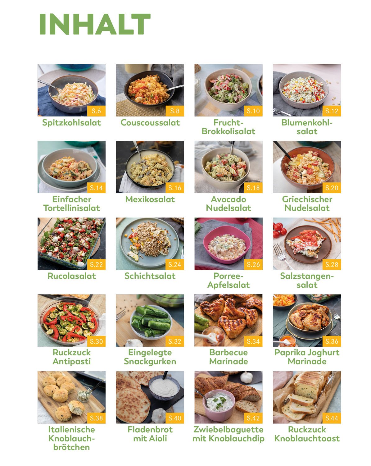 In diesem Heft findest du 20 bunt-frische Rezept-Kreationen - von verschiedenen Nudel- und Kohl-Salaten bis hin zu leckeren selbstgemachten Marinaden -, die du zu jeder Jahreszeit und sogar Events mit Familie und Freunden zubereiten kannst. Die Rezepte bedürfen nur eine kurze Zubereitungszeit und können mit deinen Lieblingszutaten oder -gewürzen individuell verfeinert werden.